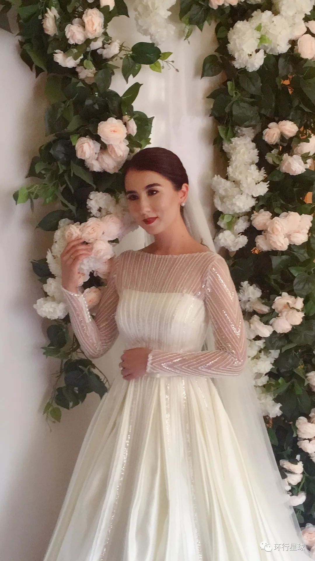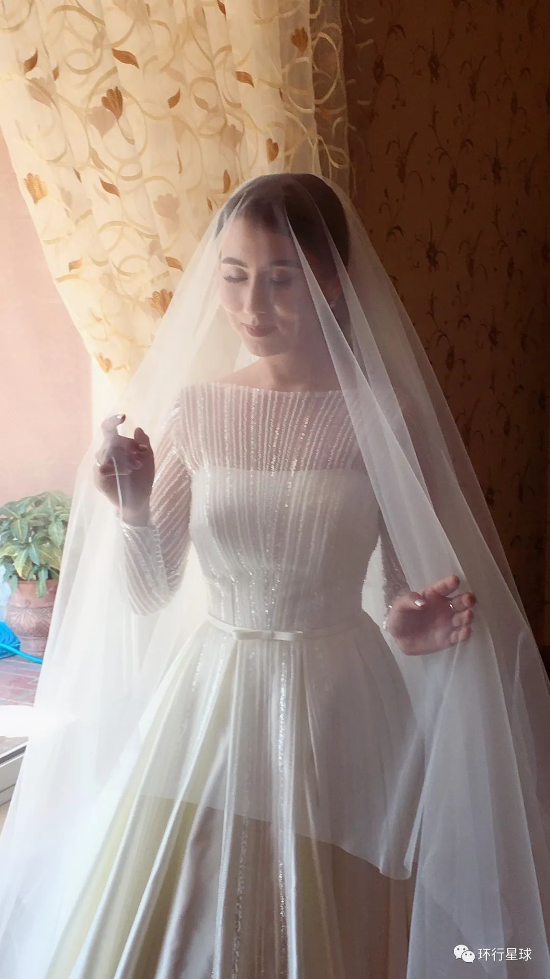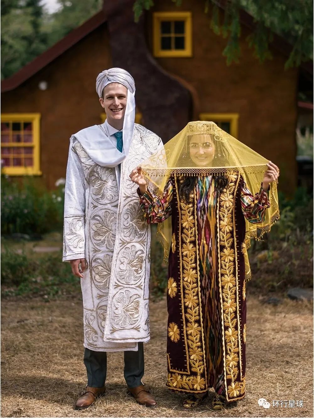 值得一提的是,新郎虽然大部分时间是以西装为主,但在拍摄一些婚礼场景及个人最初入场的时候,需要披上白色礼服——刺绣袷袢袍子(kuyov chopon,乌国传统服饰,有长袍及类似阿拉伯缠头巾的帽子,服饰上绣着金色或银色的丝线花纹),象征对乌兹别克传统文化的回归。