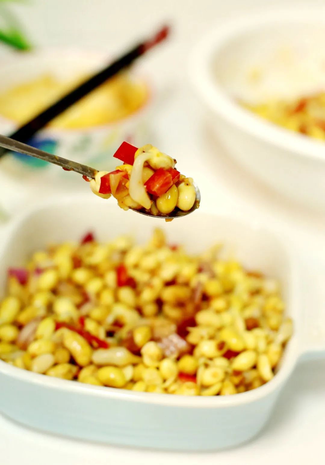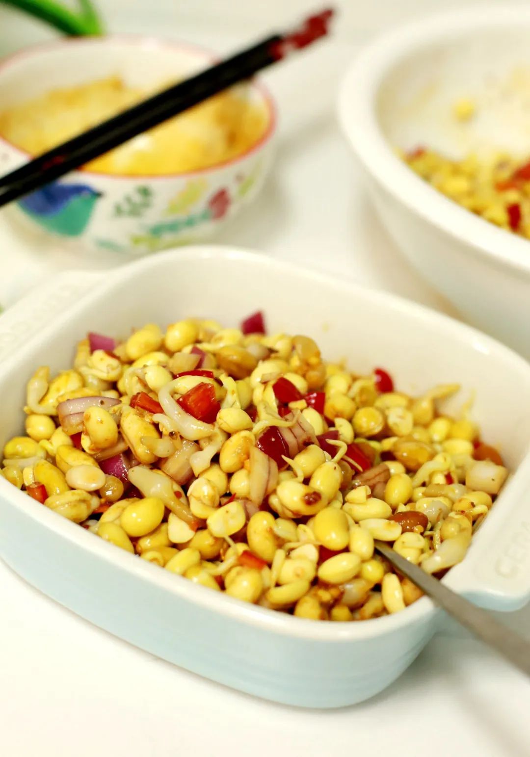 我还发了一点黄豆嘴儿,和黄豆嘴儿一起焯水,然后加点洋葱、红椒,一起拌,营养又美味,强烈推荐亲们试试哦......