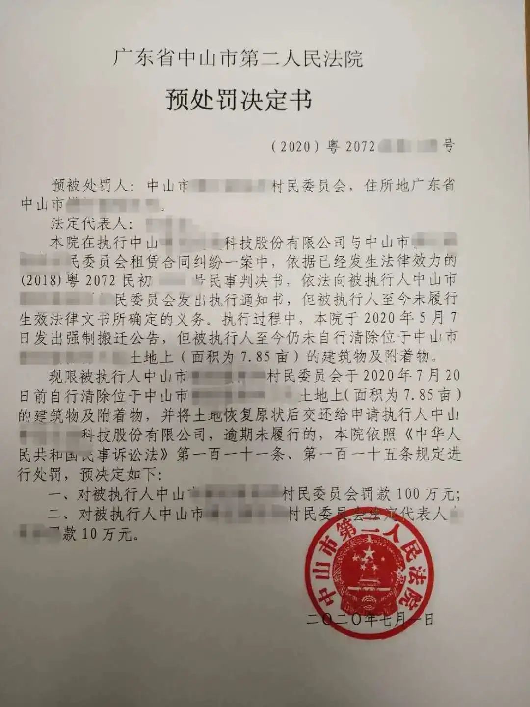 某科技公司与某村委会租赁合同纠纷一案,根据生效判决,某村委会应自行清除承租土地上的面积为7.85亩的建筑物及附着物。因其拒不履行,某科技公司申请强制执行。在执行过程中,被执行人仍占有该建筑物拒不履行。执行过程中,承办法官2020年7月1日依法发出《预处罚决定书》,并于2日前往该村委会找到相关负责人当面告知和出具决定书,拟对该村委会罚款100万元,对其主要负责人法院10万元,迫于法律威慑,该村委会自行拆除土地上的构建筑物,该案终于得以圆满执结。