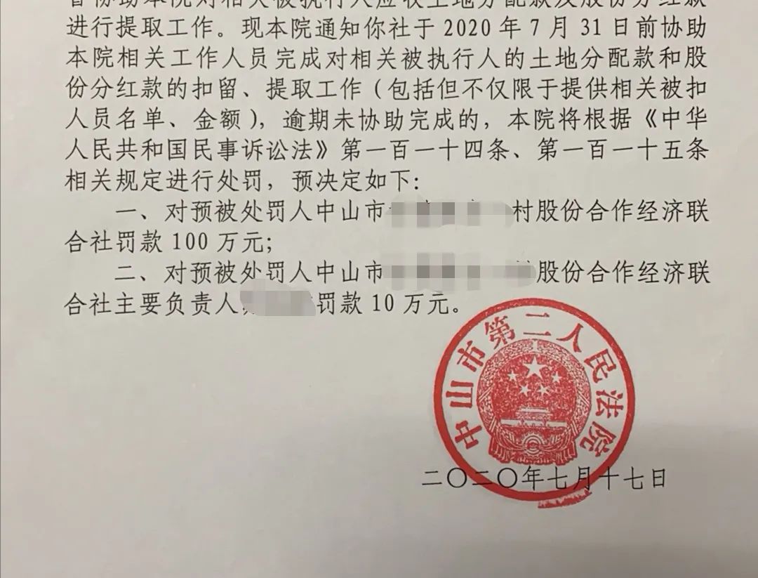 我院多次依法要求某经联社协助扣留、提取被执行人的土地分配款以及股份分红款。但是该社一直不予配合,为执行工作增设阻碍。经执行局领导研究后决定,于2020年7月17日经依法发出《预处罚通知书》,责令其限期履行协执义务,否则将对该经联社处罚款100万元,对主要负责人罚款10万元。接到《预处罚通知书》后,该相关人员主动承认错误并积极协助本院进行扣留、提取工作,主动将近60万元的土地分配款、分红款缴纳至法院账户,并保证日后一定积极配合法院执行工作。