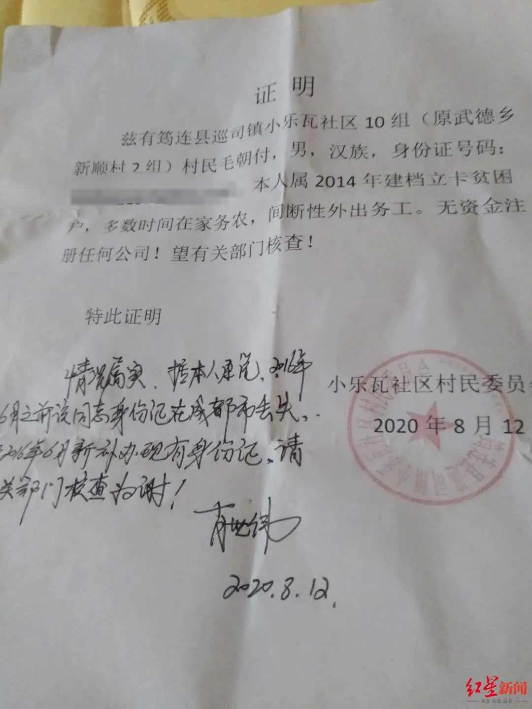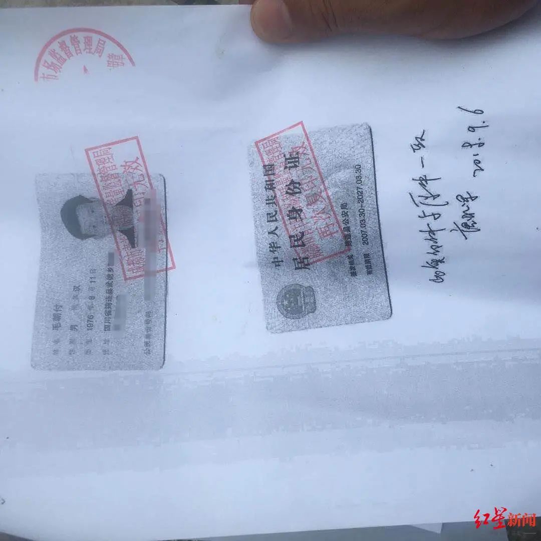 红星新闻记者从宜宾市筠连县公安局了解到,毛朝付确实于2016年6月,以身份证遗失为名申请补办了身份证。巡司派出所接到毛朝付反映身份证被冒用注册公司的反映后,初查确认其所遗失身份证被冒用事实,并将情况通报给了筠连县市场监督管理部门作进一步调查处理。
