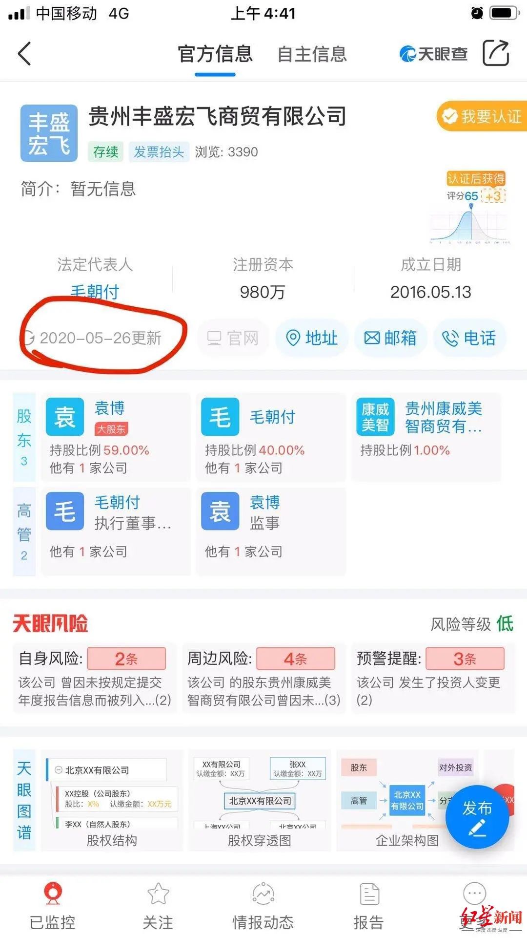 随后,毛朝付辞了工作,返回老家处理此事。通过查询得知,毛朝付被注册的公司一共两家,其中一家是注册资金980万元的贵州丰盛宏飞商贸有限公司,注册于2016年6月。毛朝付在该公司持股40%,认缴资本金为392万元;另一大股东叫袁博,其持股59%。毛朝付是“丰盛宏飞”的法定代表人、执行董事兼总经理。