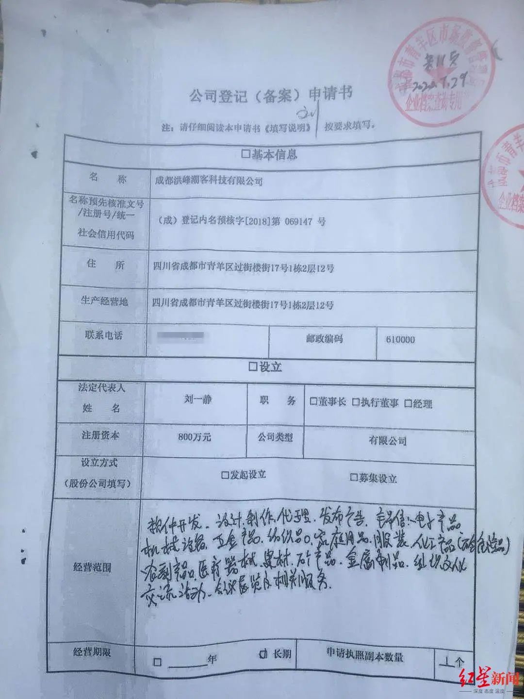 而在成都,毛朝付按照注册地址,也没有找到自己“投资800万”设立的“洪峰潮客”公司。在成都市青羊区市场监督管理局,毛朝付获取了《公司登记(备案)申请书》、《委托书》、《股东决议书》和《公司章程》的资料。