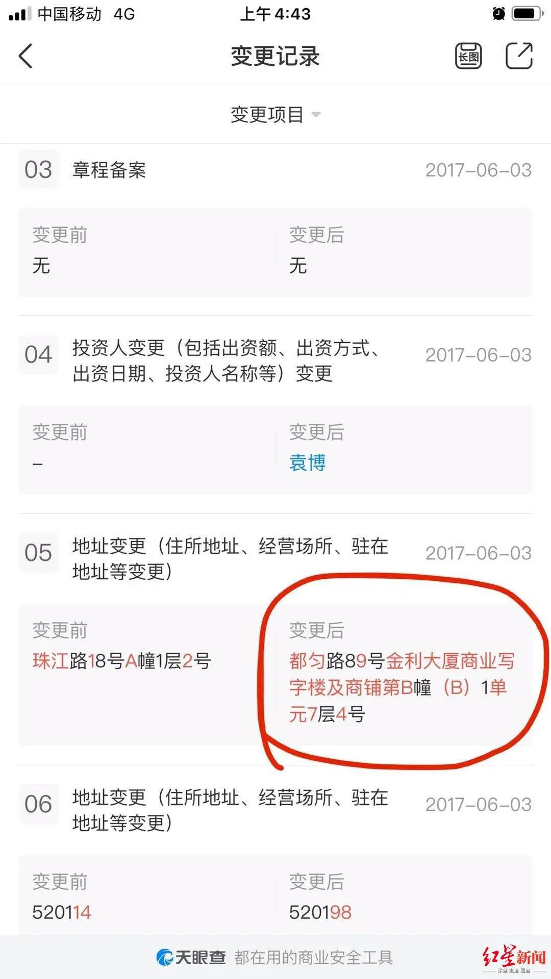 红星新闻记者了解到,贵州丰盛宏飞商贸有限公司,注册地历经三次变更,最后的登记地址为贵阳市都匀路89号金利大厦商业写字楼第B栋1单元7楼4号。注册登记时留下的手机号码,已经变成了空号。