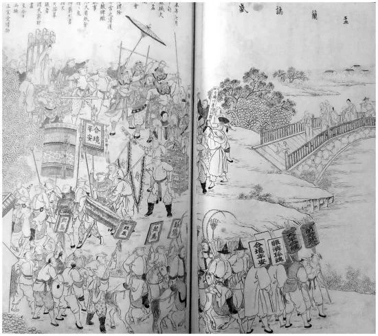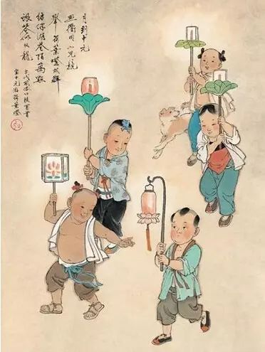 形象描绘了中元夜儿童持荷叶灯结伴游乐的情景