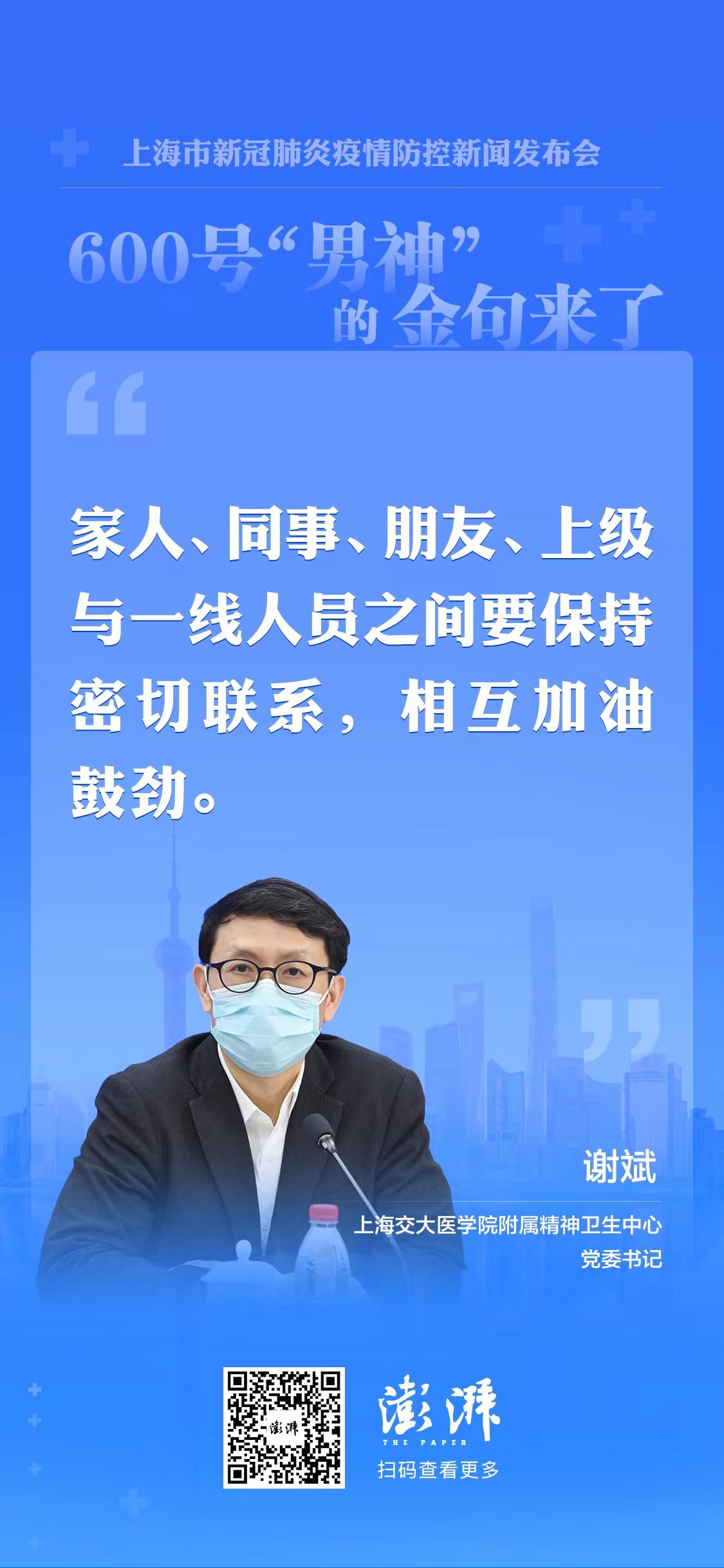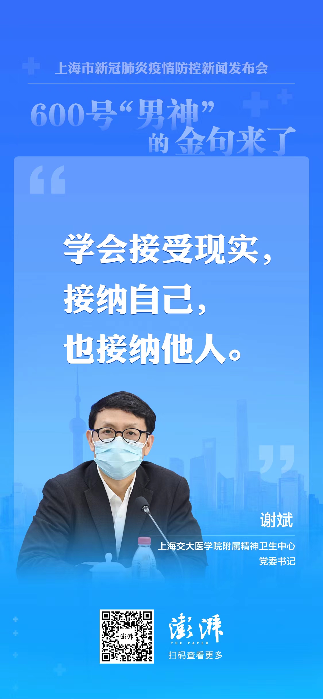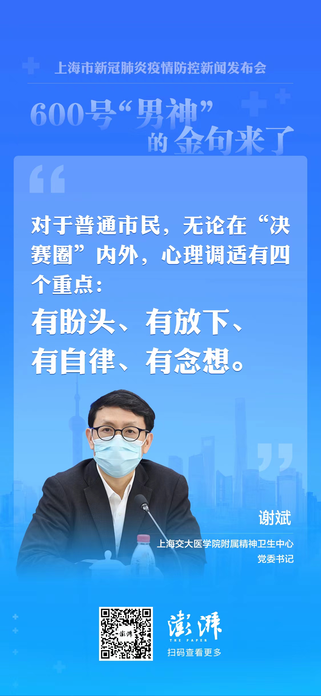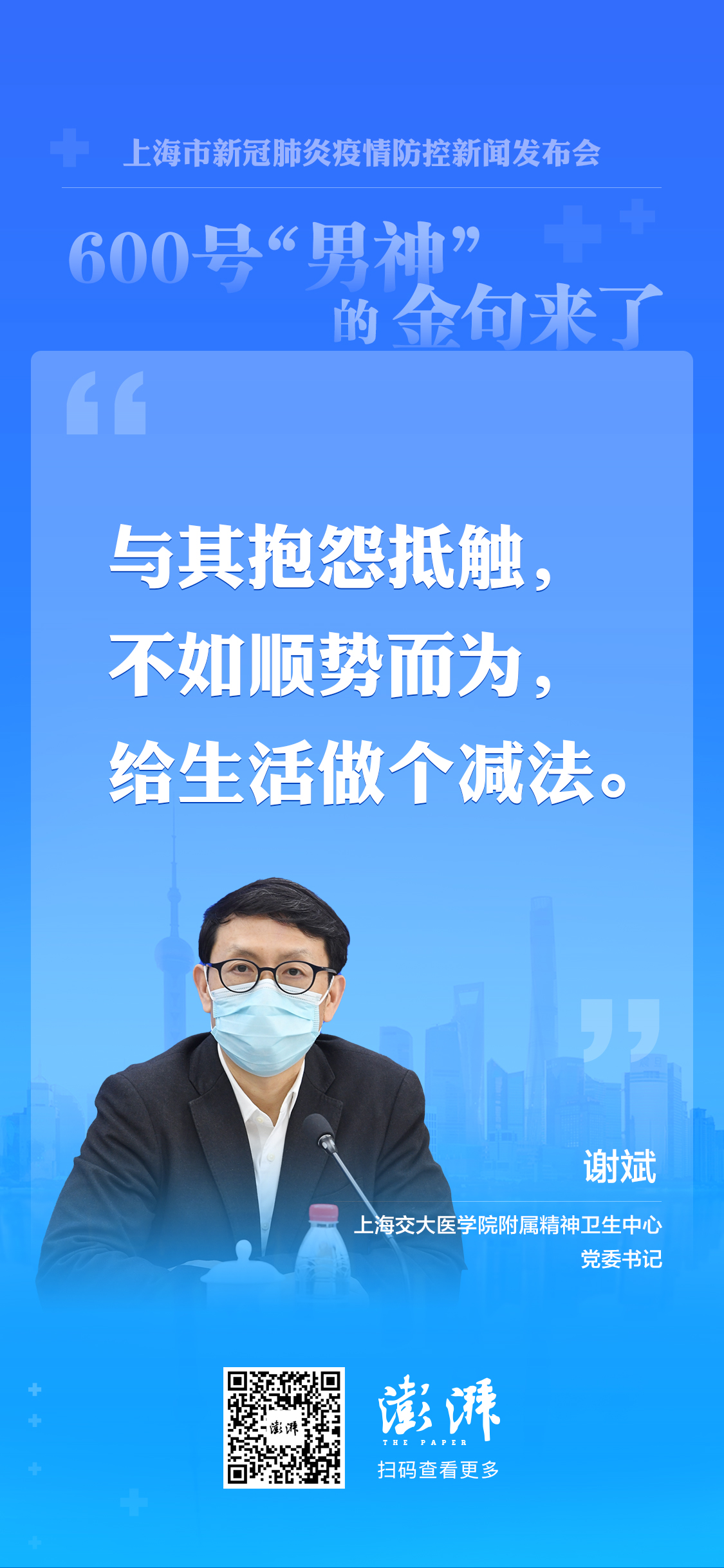 谢斌说,宛平南路600号被戏称为上海最后的家底,今天我跑到这里来,大家完全可以对上海这次抗疫有底气,能够放心。疫情已经两年多了,大家已经经历过相似的冲击多次了,已经总结了很多有用的心理调适经验,现在重新翻出来也都管用。 这次疫情跟以往相比,对心理方面的冲击像你刚才说的,是主要跟生活受到影响有关。而不同的人群,生活受影响是不同的。