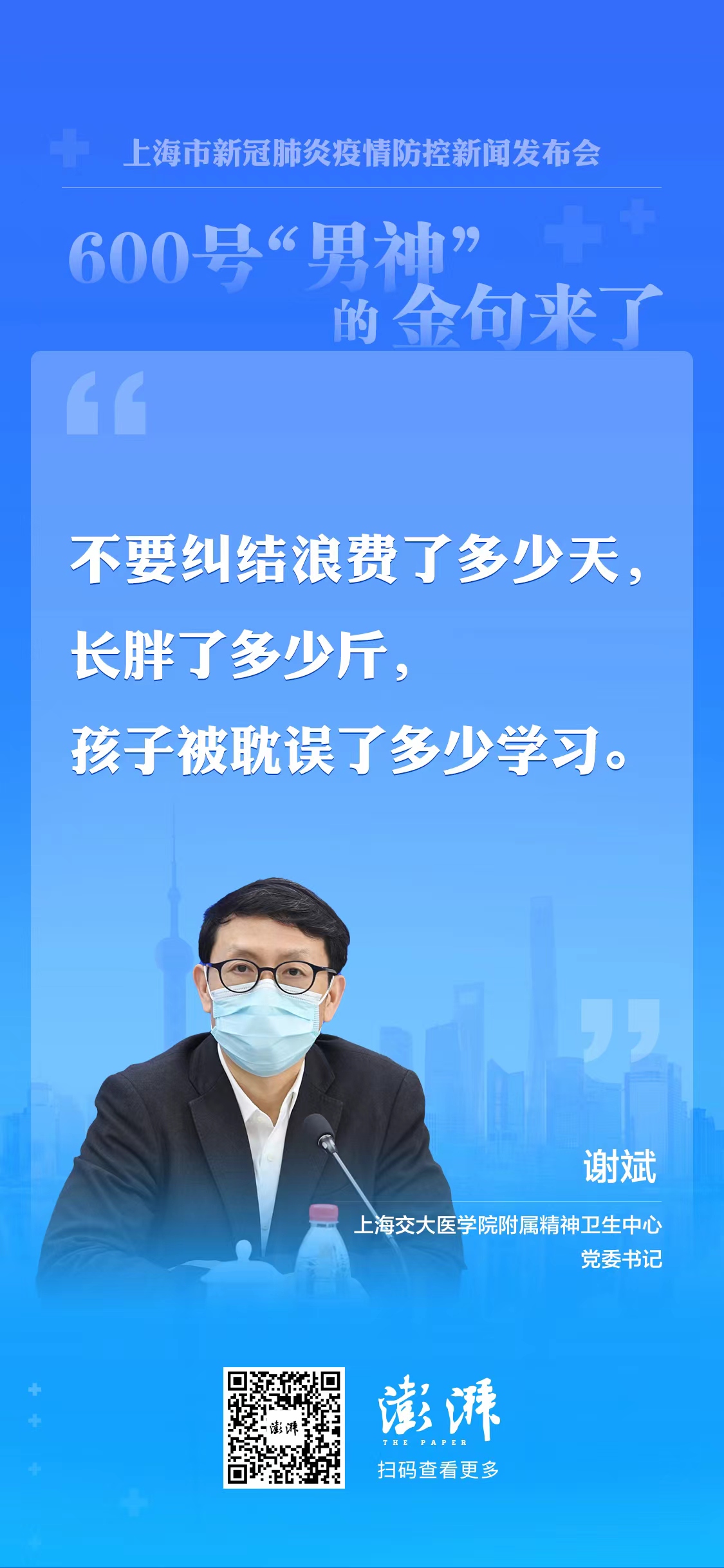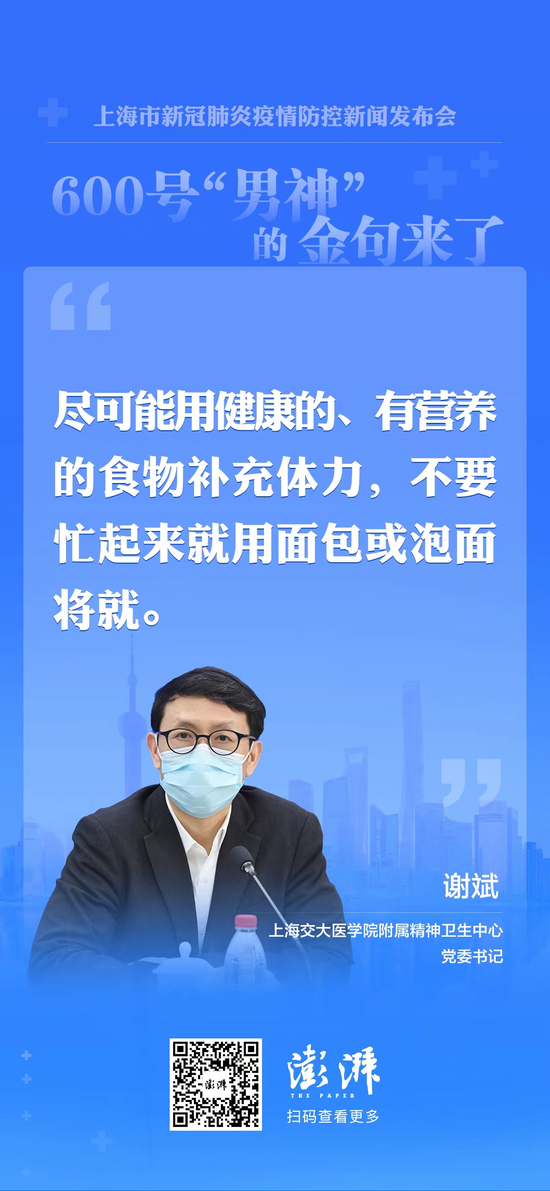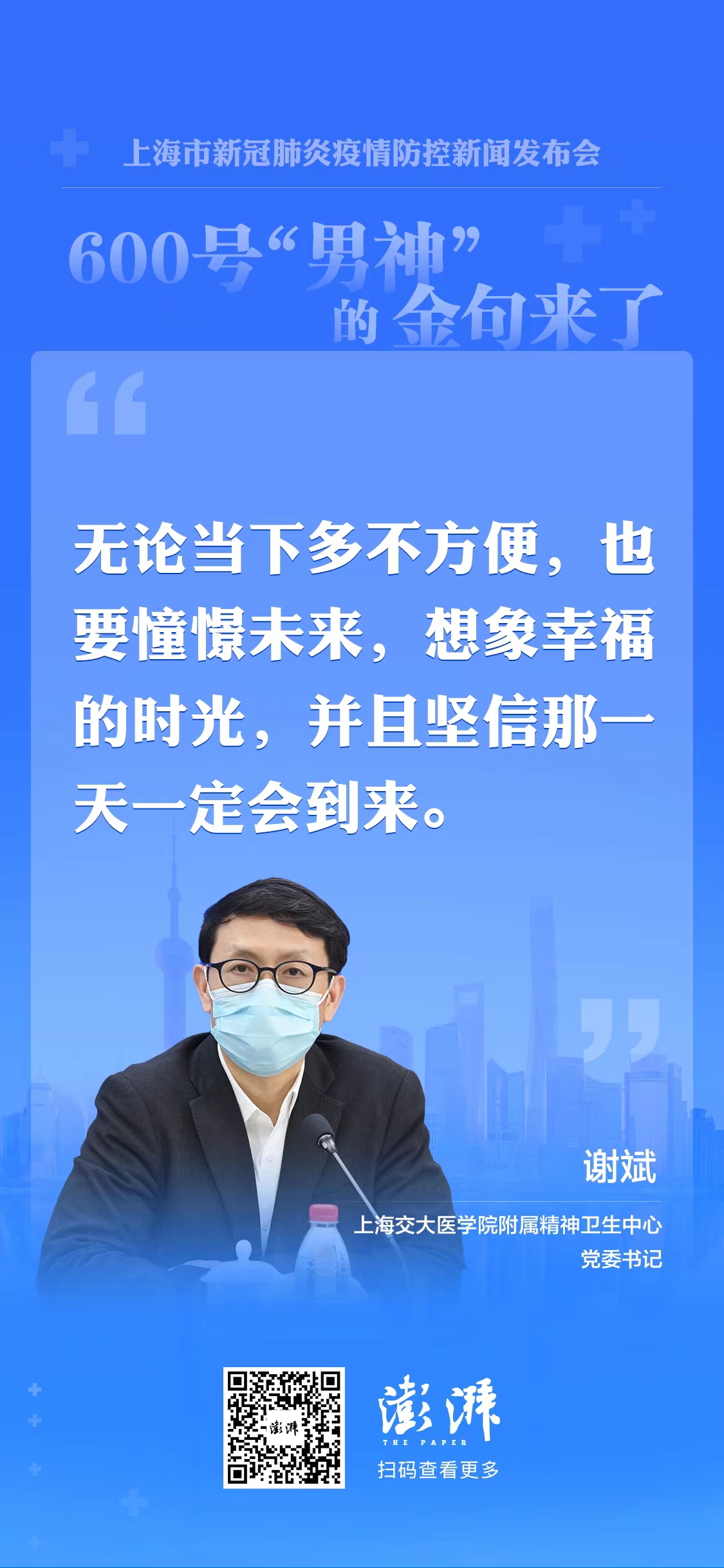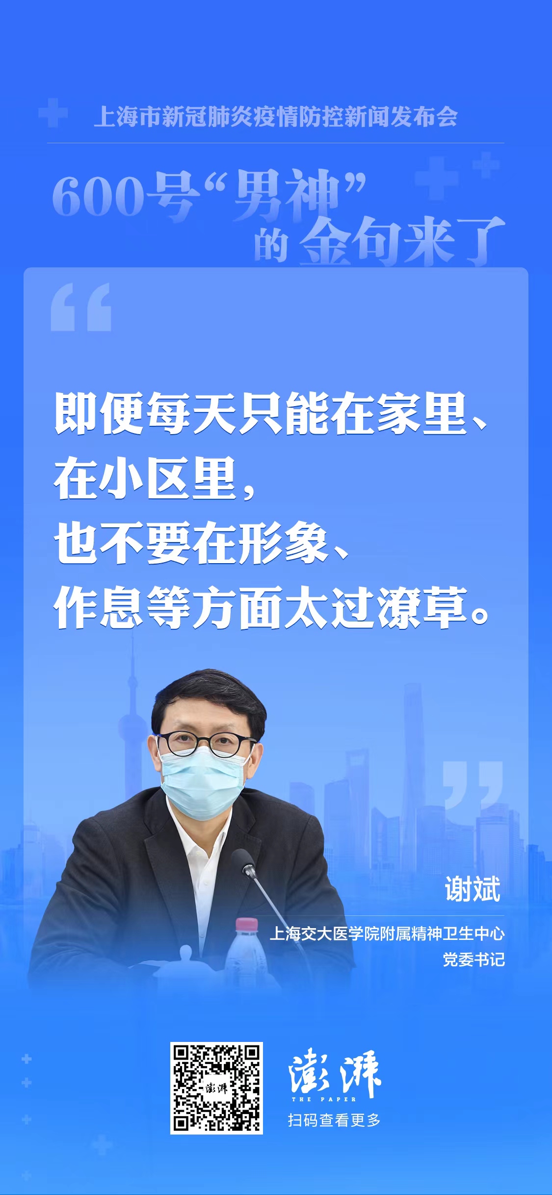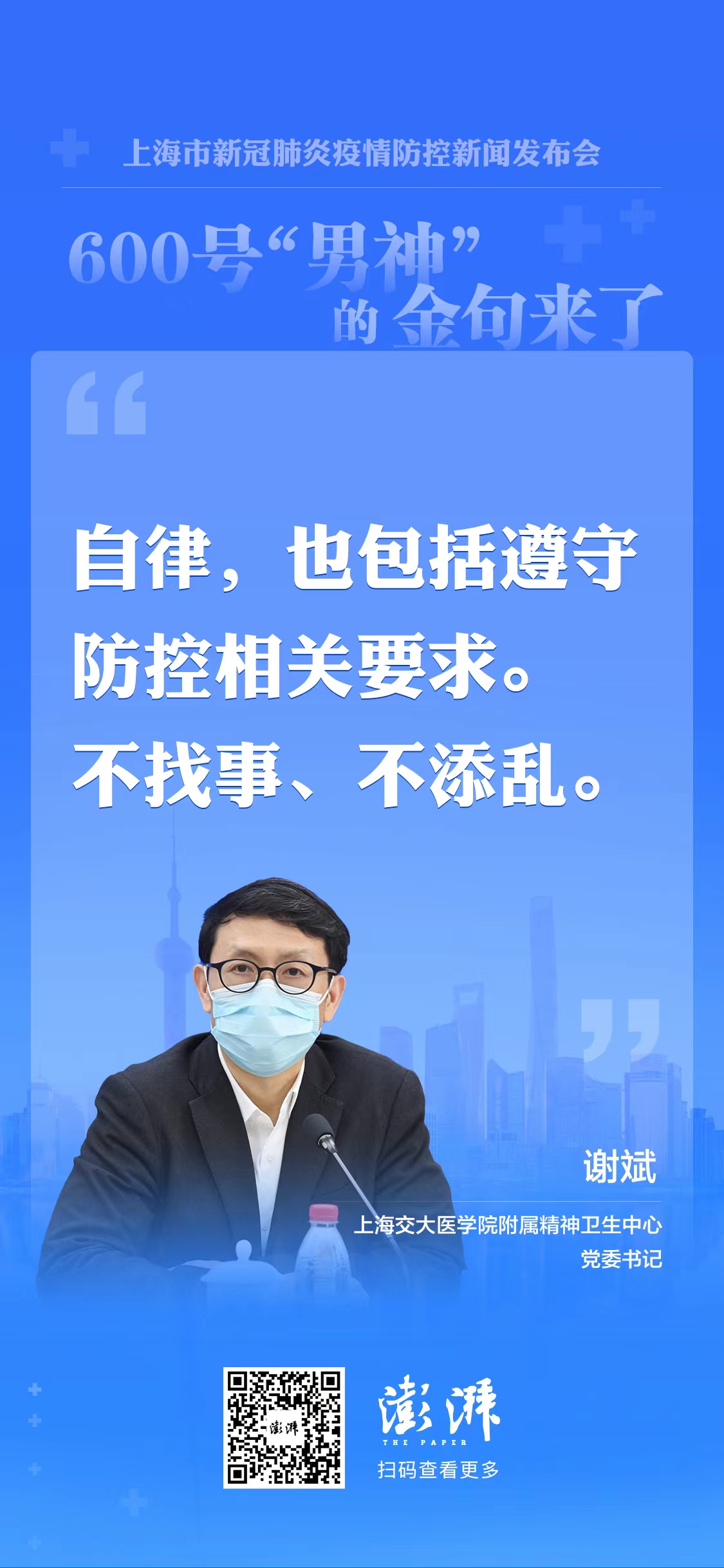 谢斌说,宛平南路600号被戏称为上海最后的家底,今天我跑到这里来,大家完全可以对上海这次抗疫有底气,能够放心。疫情已经两年多了,大家已经经历过相似的冲击多次了,已经总结了很多有用的心理调适经验,现在重新翻出来也都管用。 这次疫情跟以往相比,对心理方面的冲击像你刚才说的,是主要跟生活受到影响有关。而不同的人群,生活受影响是不同的。