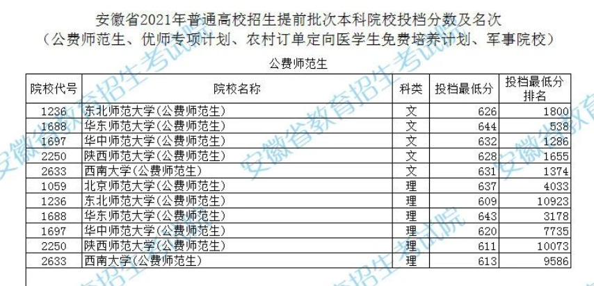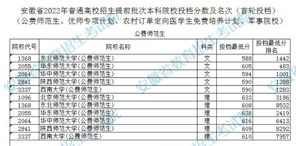 公费师范生方面,华东师范大学的投档线仍为最高,其文科最低投档分605分,排在全省483名,理科最低投档分为638分,排名在2419名,超过北京师范大学(无文史类招生计划)的633分。