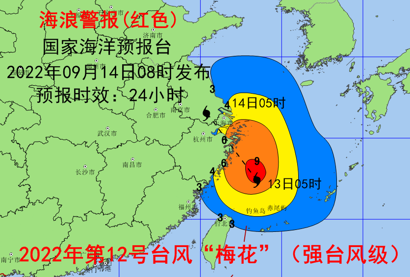 9月14日,澎湃新闻(www.thepaper.cn)从自然资源部获悉,14日早上8时,台风“梅花”(强台风级)的中心位于距离浙江省象山县东南方向约225公里的海面上,当天下午至夜间将在浙江温岭到舟山一带沿海地区登陆,国家海洋预报台14日早上继续发布海浪红色警报和风暴潮橙色警报。