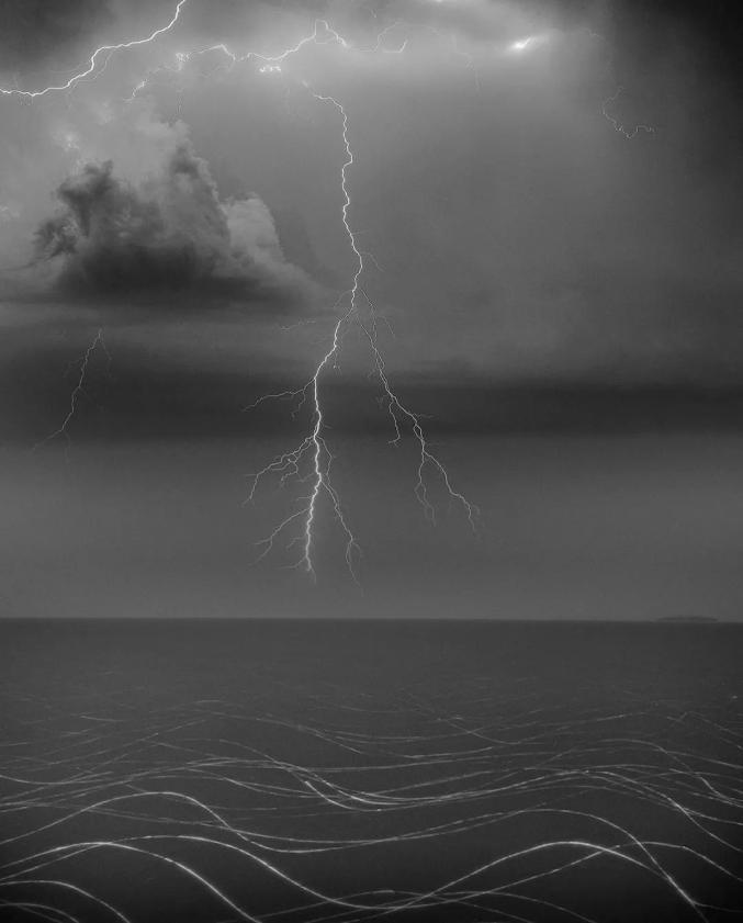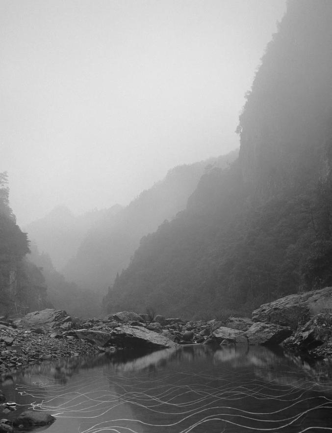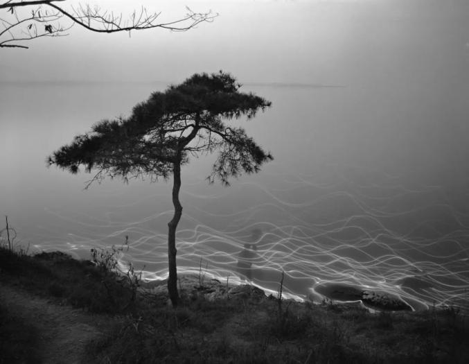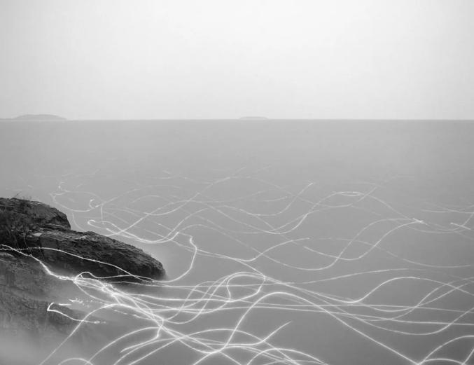 这个系列的开始也是如此。这本来也是我搁置一边的一个念头,冲动并不大,我们处在一个荒诞的世界与时代,现实吸引眼球的事情太多了,躲在水边画波浪的确有些无聊。但某一天,我有莫名的冲动,随即就收拾起器材行动起来了,一旦开始,我立刻被一种久违了的宗教感所牵引,这种仪式感触及生命与世界最深处的本质。创作过程面临了很多前所未有的困难,有时经过数小时的等待,最后拍摄时刻突然开来一艘亮着灯光的渔船,这一天就浪费了,因为每次都是在夜幕降临的那一刻开启快门,至天色完全黑下完成拍摄,曝光时间在五到十分钟左右。还有一次我远赴普陀山,选了一个能看到寺庙一角的水面架好相机等待,天将黑时突然发现近处的水没了,全是泥滩,原来是退潮了。但越是这样,我越如着魔一般坚持,面对苍茫浑穆的水面,我心存敬畏,挥动手中的光笔,光线刺破水面,在胶片上留下或轻匀缓慢、或恣意汪洋的波纹。在曝光的整个过程中,我始终被一种类似宗教的仪式感笼罩着。每一笔镭射光都瞬间消失在沉郁模糊的水面上,我甚至怀疑胶片是否能捕捉住我内心与自然碰撞的轨迹,这波澜或忧伤或焦虑,或激昂澎湃、荡涤俗情,或闲淡平静、涟漪轻缓。