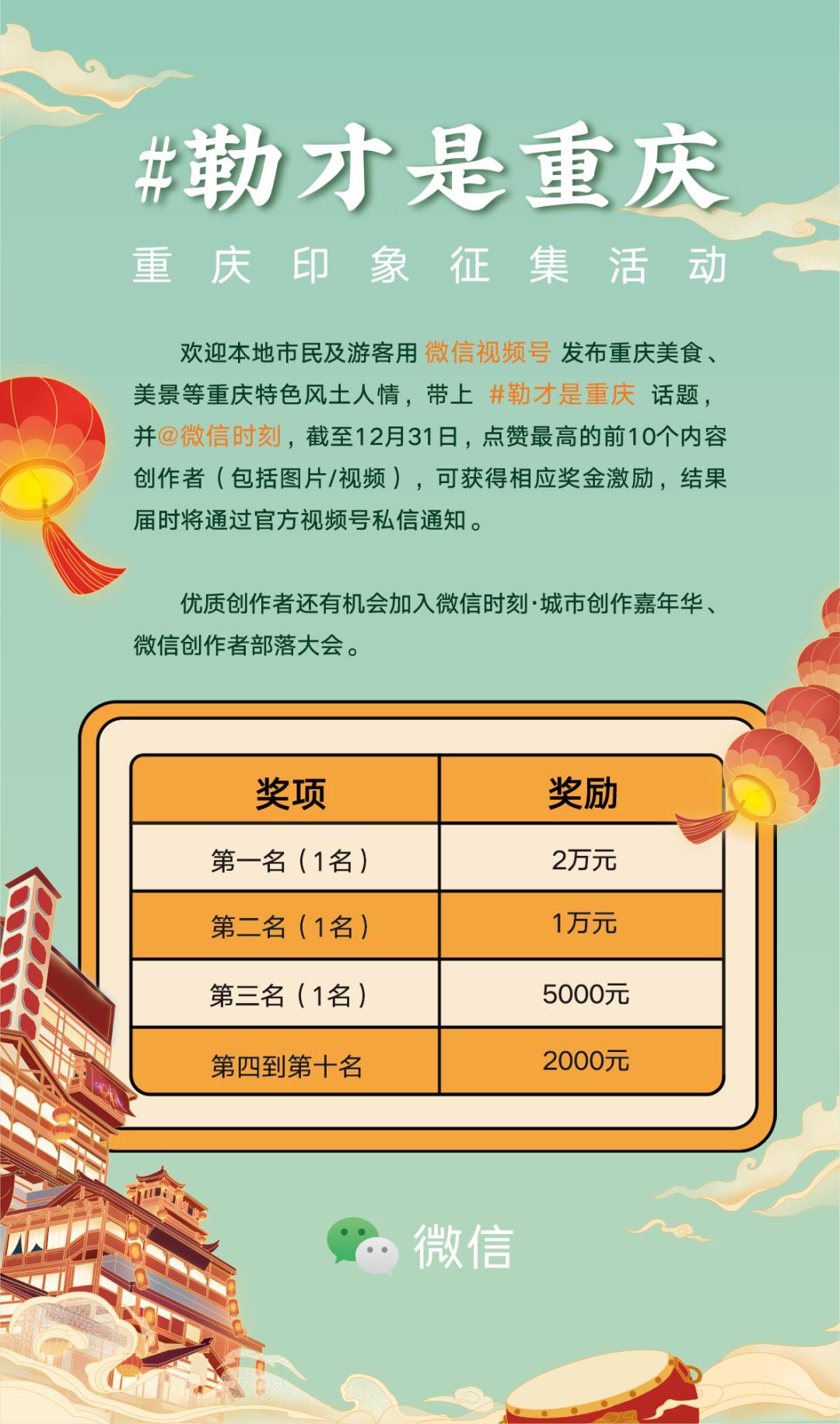 即日起至12月31日,只要在微信视频号上带上 #勒才是重庆话题发布相关内容,并@微信时刻 官方账号即可参与活动,结果将在“微信时刻”视频号上公布。