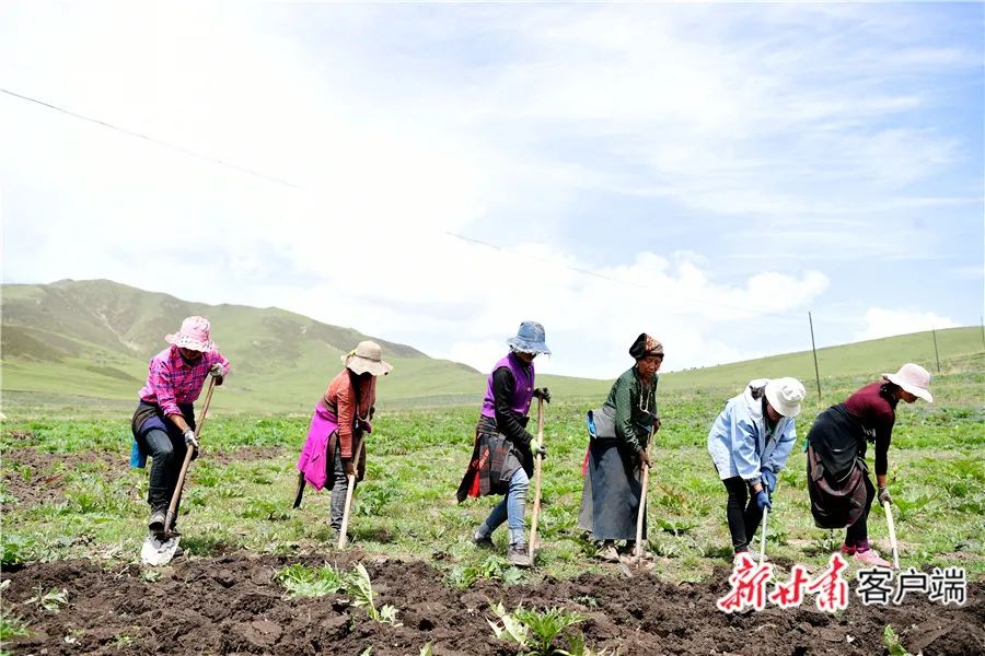 阿子滩镇阿子滩村特大黄种植基地里,唐古特大黄长势良好,几名藏族妇女正在地里忙碌。海拔3100多的米阿子滩村,人均耕地十几亩,典型的人少地多,村民多种植青稞,但由于海拔高,青稞种不熟,产量也低,只能用作饲料。