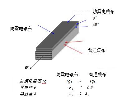 传统的防雷击方法主要是使用金属网或者在碳纤维表面加入金属颗粒涂层,由此来消散雷击产生的高电流及热量,但是这种方法不仅会增加飞机重量并且还会带来新的腐蚀问题。为此全俄航空材料研究院特研发了一种新型的防雷电碳布结构(MKY),该结构由两层碳布组成:一层是加入防雷击纳米涂层(МЗП)的0°和45°编织碳布,另一层就是单向普通碳布(见图2)。