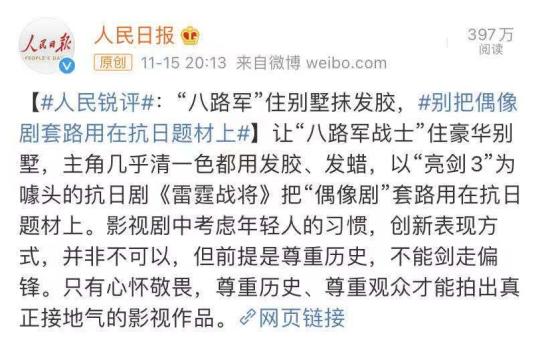据悉《雷霆战将》因给八路军使用发胶、发蜡而被人民日报、共青团中央官微等点名批评,指出其违背历史,将偶像剧套路用在抗日题材上。