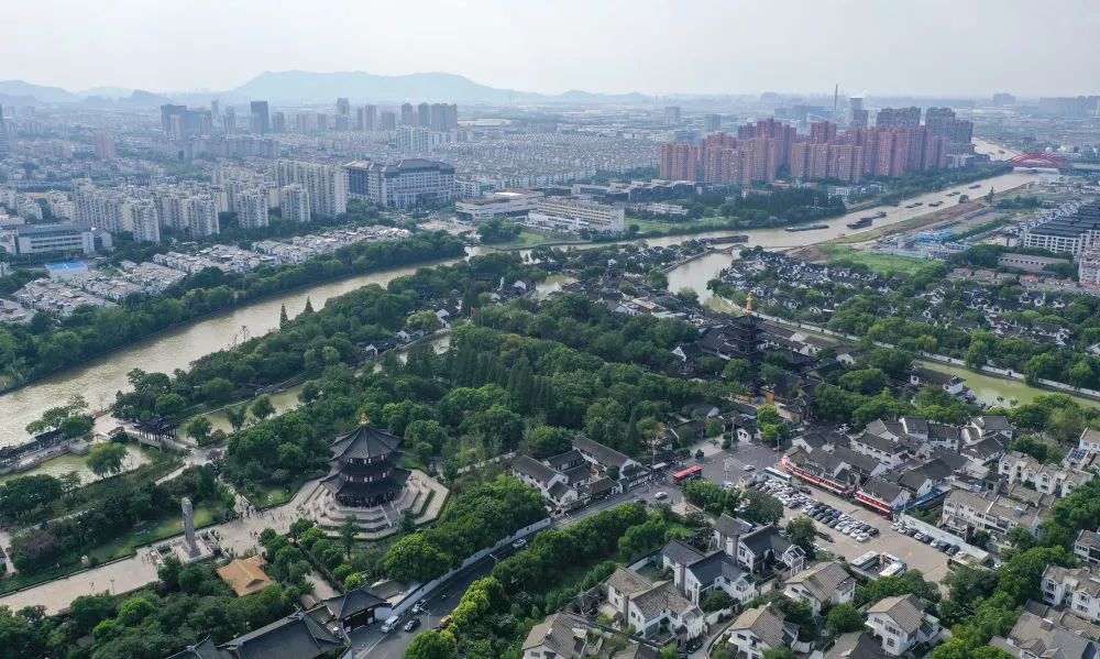 ▲无人机航拍的运河边的苏州寒山寺(8月9日摄)。
