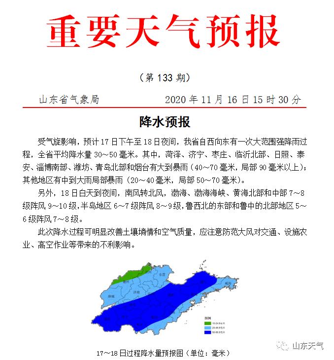 从市气象台获悉,受冷暖空气共同影响,预计17日下午~18日夜间,我市将有大雨到暴雨,过程累积降雨量全市35~55毫米,局地70毫米以上。较强降雨主要集中在18日凌晨至上午,18日下半夜降雨逐渐结束。同时,受地面气旋影响,17日夜间~18日我市南风陆地5~6级阵风8级,海上7~8级阵风10级。