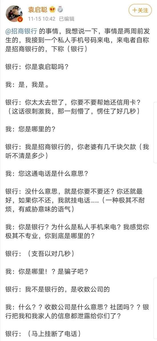 11月15日,微博大V资深车评人袁启聪发布微博讲明来龙去脉。两周前,他接到一个私人手机号码来电,询问“你太太去世了,你要不要帮她还信用卡”,来电者自称是招商银行的,随后在追问下改口“是收数公司”的。当被问及如何取得袁启聪及家人信息的敏感问题时,来电者立即挂断电话。