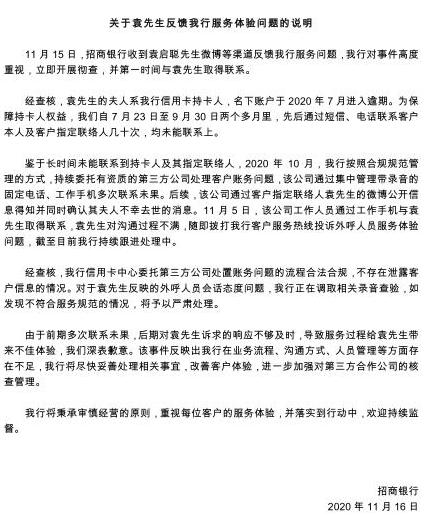 针对此事,11月16日晚,招商银行发布了一份《关于袁先生反馈我行服务体验问题的说明》,表示并无违规泄露客户信息。
