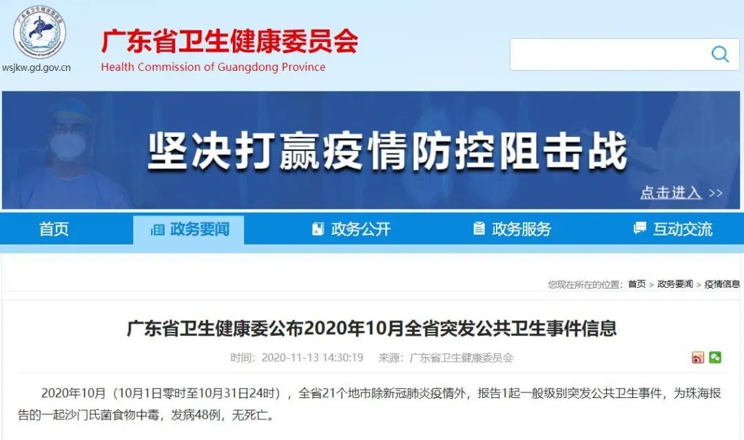 10月1日零时至10月31日24时,广东全省21个地市除新冠肺炎疫情外,报告1起一般级别突发公共卫生事件,为珠海报告的一起沙门氏菌食物中毒,发病48例,无死亡。