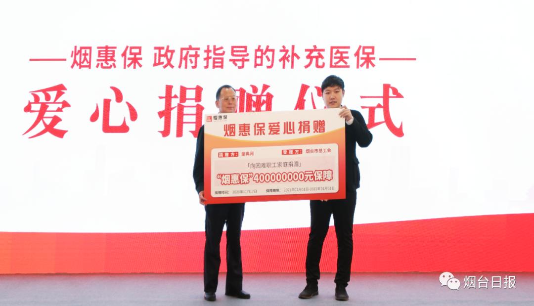 发布现场,烟台市总工会和烟台市民政局分别代表困难职工家庭和生活困难群众接受了烟台爱心企业量典网捐赠的保额总价达4亿和20亿“烟惠保”保障。让每一份“烟惠保”温暖一个家庭。