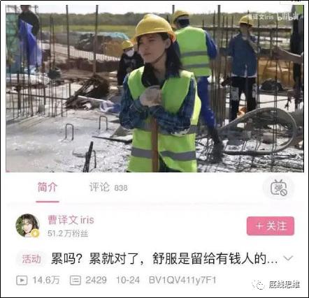 10月24日,B站UP主@曹译文iris 上传了一段名为《累吗?累就对了,舒服是留给有钱人的》的视频。