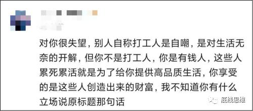 “别人自称打工人是自嘲,是对生活无奈的开解,但你不是打工人,你是有钱人,这些人就是为了给你提供高品质的生活,你享受的是这些人创造出来的财富,我不知道你有什么立场说原标题那句话。”