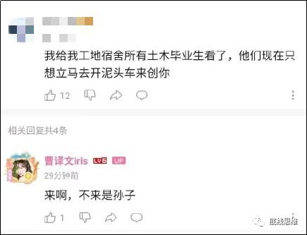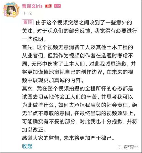 11月12日,她在这段视频的评论区置顶了自己的道歉,承认自己选题时考虑不周,伤害了土木工程从业者的感情。