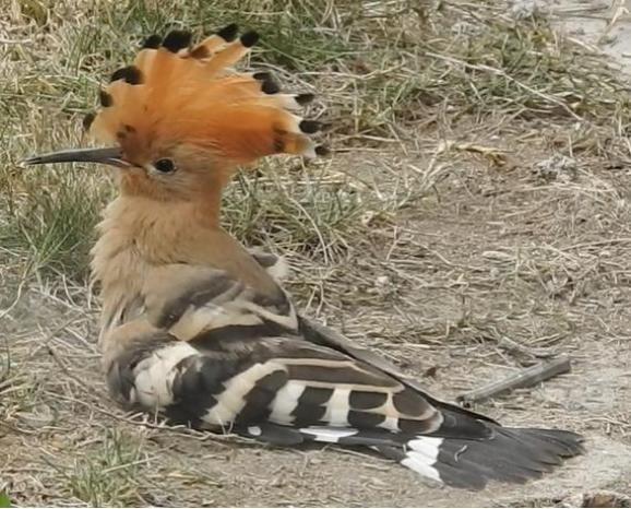 头部具细长的橙色而末端黑色的冠羽,展开时在整个头部上方形成近方形的茂密羽簇。嘴细长而下弯。前半身橙棕色,翅膀及尾部黑白斑纹交错,展翅时翼下方的黑白条纹十分明显。体型与校园常见的斑鸠相近(约30cm)。