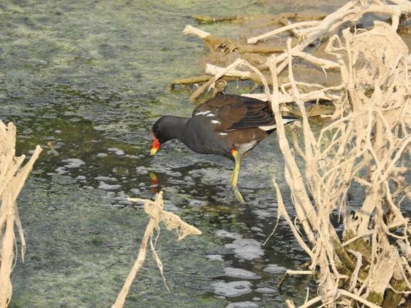 黑水鸡虽然名字里有鸡,但并不是我们常见意义上的鸡。黑水鸡属于秧鸡科、鹤形目,与我们熟知丹顶鹤亲缘关系更近,而不是鸡。黑水鸡全身黑色,两胁有一条白色细纹,具有红色的嘴和额甲,脚较长。