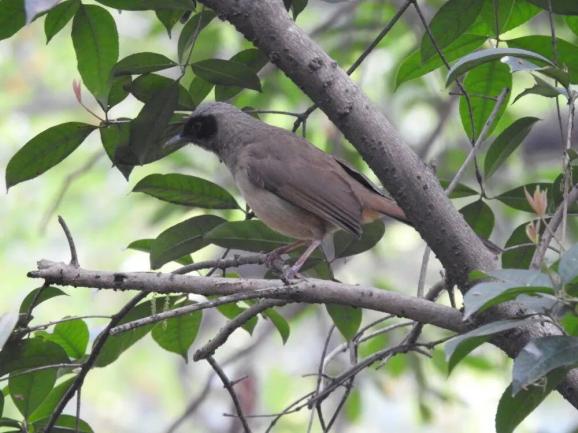 通体黄褐色,尾羽比较长且直。鸟如其名,眼睛周围有围绕额部至头侧的宽阔黑带,状如戴的一副黑色眼镜,极为醒目。当然,黑脸噪鹛响亮的叫声,也恰好如名字里的“噪”字一般,其夏季鸣叫尤为频繁,鸣声响亮,单调而粗涩,听后让人难忘,其声似“diu-diu”。常常一只鸟鸣引起整群甚至其他群的鸟亦跟着鸣叫不息。