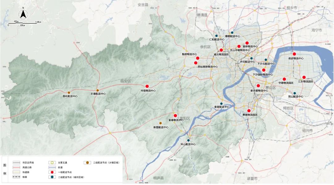 在13个物流枢纽内配置一级配送节点的功能,同时基于服务覆盖的原则,设置10处二级城市配送节点,社区配送点结合社区服务中心、商业服务设施等设置,服务半径不宜大于1千米。