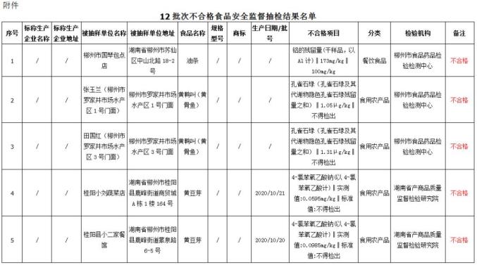 1.郴州市国琴包点店销售的油条,经郴州市食品药品检验检测中心检验,铝的残留量(干样品,以Al计)项目实测值173mg/kg(标准值≤100mg/kg),不符合食品安全国家标准的规定。
