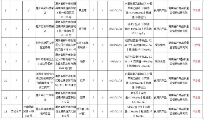 1.桂阳县彩环蔬菜店销售的绿豆芽,经湖南省产商品质量监督检验研究院检验,铅(以Pb计)项目实测值0.179mg/kg(标准值:≤0.1mg/kg),不符合食品安全国家标准的规定。