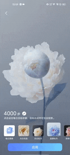 甚至,你还可以设置每天的目标步数,让行为壁纸上的花朵,伴随你的步数增加而绽放。