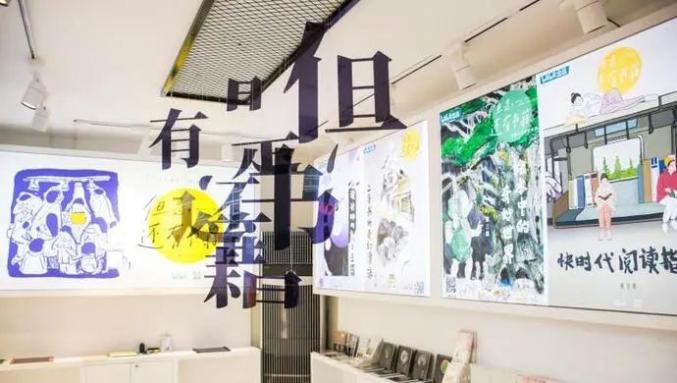 “图书盲盒”也是这里的特色之一。书店推荐的书单里,会有几本书进入盲盒,买书的人并不知道里面是什么书,怀着期待打开时总能得到惊喜。“次元指挥部”是《但是还有书籍》的线下平面展示,纪录片的海报依次在墙上展开,片名的每一个字都被拆成部首,轻轻地在空中微微地摆动着,纪录片记载过的图书一本本在读者眼前,一个个场景在这里再现。