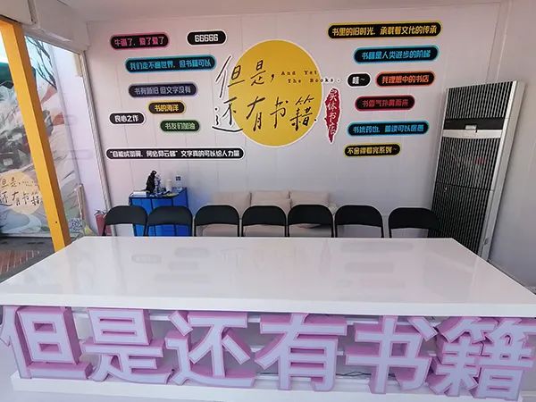项目负责人王祥很多时间都坐在集装箱群的第一间,那里有最醒目的大字:“但是还有书籍”。他天天在这里和店员们一起整理图书,给容易损坏的书包上封皮,策划安排下一步的活动,做好活动的准备工作。这个半敞开的集装箱,同时也是书店的直播间,为粉丝们直播书店,分享大咖们的读书心得,创造了书籍的最豪华的打开方式。