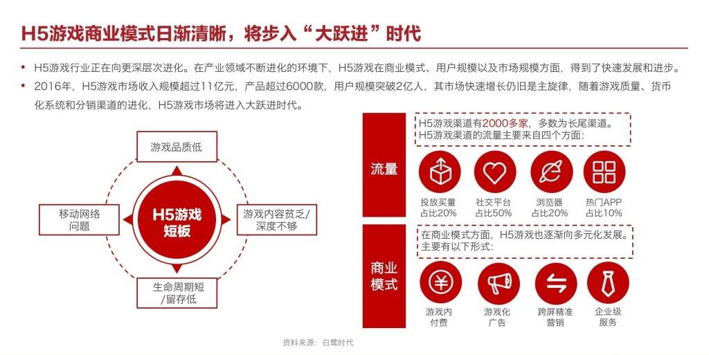 2015年,H5版本的小游戏《愚公移山》实现了月流水百万的突破,通过道具付费模式在商业化和自我盈利上迈出了属于H5游戏的第一步。2016年,首款流水突破千万的H5游戏《传奇世界H5》上线,国内游戏市场再次见识到了H5游戏强大吸金能力。