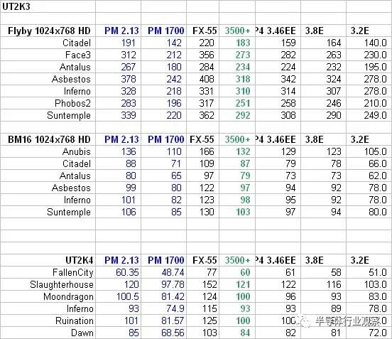 但让我们重新看看这些内容:PM代表Pentium M,它在2.13GHz和1.7GHz下进行了测试。FX-55是AMD的单核Athlon 64,具有2.6GHz的双通道内存。3500+是2.2 GHz双通道Socket 939上的Athlon 64 3500+,而P4 3.46EE,3.8E和3.2E都是基于Prescott的奔腾4。这些还具有双通道RAM。