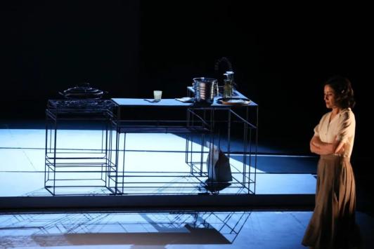 配合着场景的变化,运用幽暗的红色光线,营造出弗兰克和莫琳的秘密空间;时而投下玻璃般的蓝色灯光,演员们如履薄冰,犹如一场梦幻仙境;又或是从舞台侧面投出一束红色光线,映照脸部轮廓,仿佛看到爱博那颗摇摆不定的心。