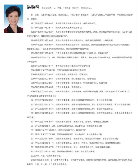 公开简历显示,谌贻琴1959年出生于贵州织金,现年61岁,白族人。谌贻琴的仕途从未离开过家乡贵州。