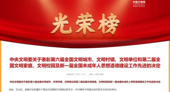 近日,中央文明委决定,表彰第六届全国文明城市、文明村镇、文明单位和第二届全国文明家庭、文明校园及新一届全国未成年人思想道德建设工作先进。