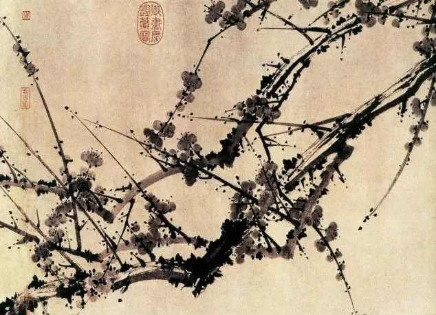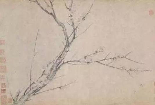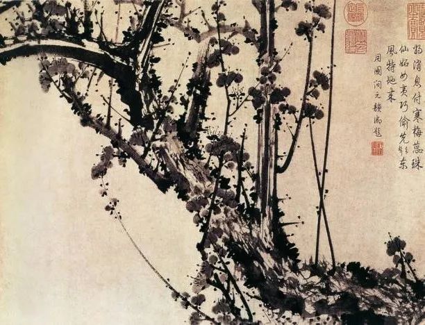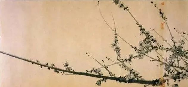 此图梅枝横斜而出,枝条简疏。枝节交叉处梅花竞相吐蕊开放,表现了王冕野梅的清绝韵致。笔墨精练蕴藉,主干以淡墨挥洒,浓墨点苔,苍古老拙。分枝以中锋勾撇,挺拔坚韧。