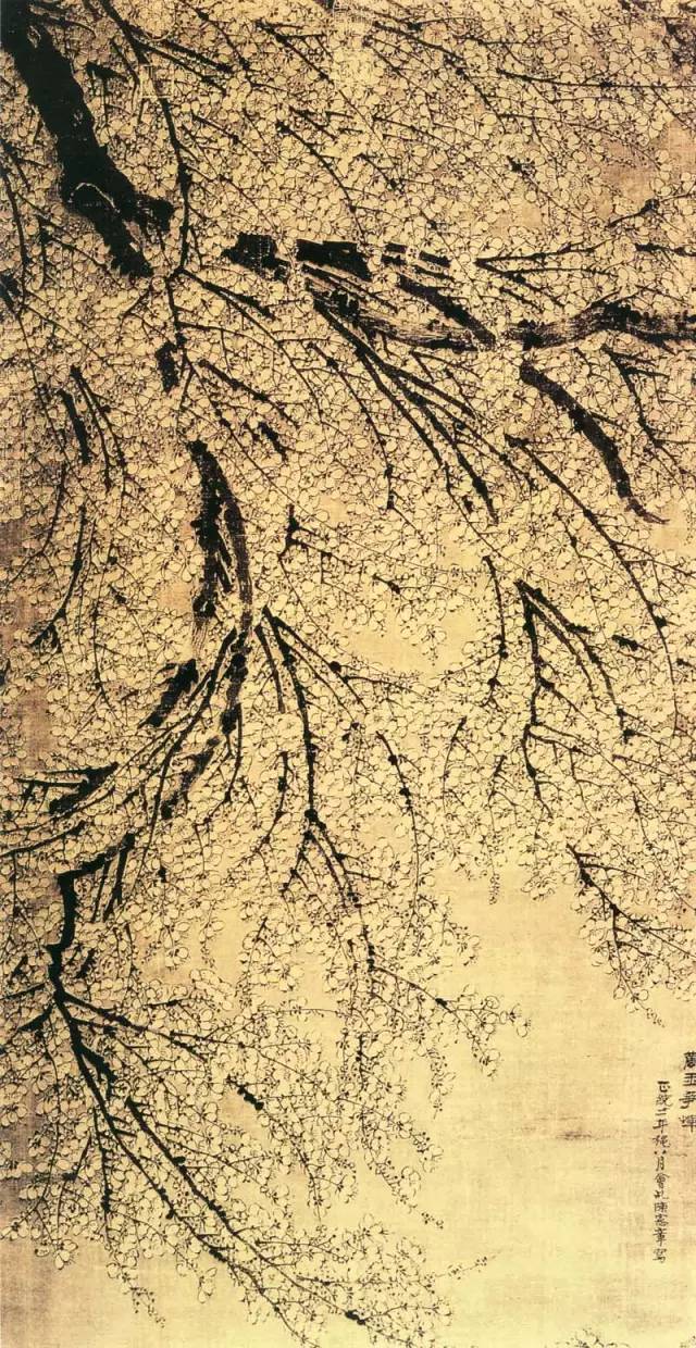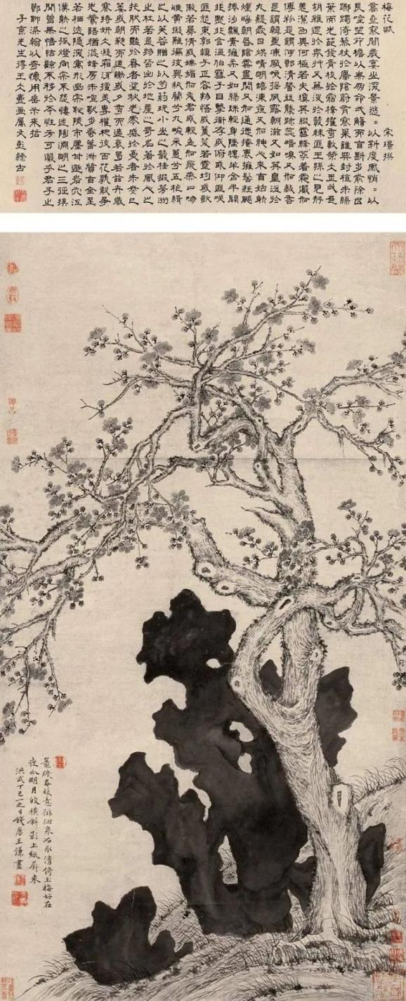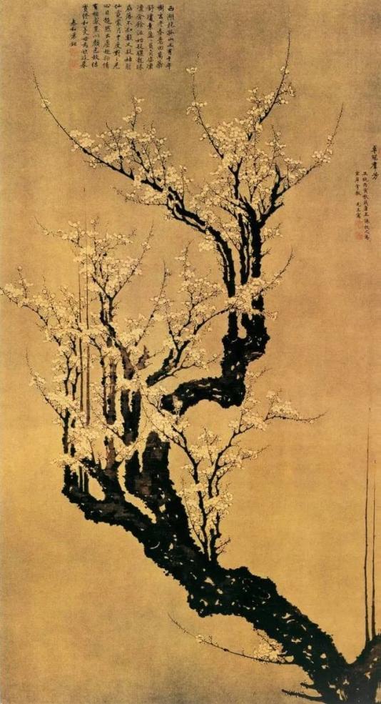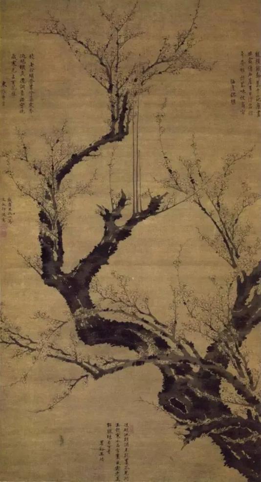 这幅梅花图与画家的《万玉图》有异曲同二之妙,但在气势上更觉恢宏。此图梅干自左出,倒垂而下,分为二枝,一枝弯曲直下,一直平伸出画面,但细枝侧条全取披垂之势,与总的动势保持一致。画面上繁花密蕊、璎珞纷呈,千条万玉,扑面而来。构图上将主干分散从而强调密如万玉的花朵本身的美感,有一种喜气洋洋的氛围,体现了画家躬逢明王朝“盛世”,而“借花献佛”,以写“梅花得意羡群芳”的心情,从而少了王冕画梅之中的那种孤傲和清雅之气。