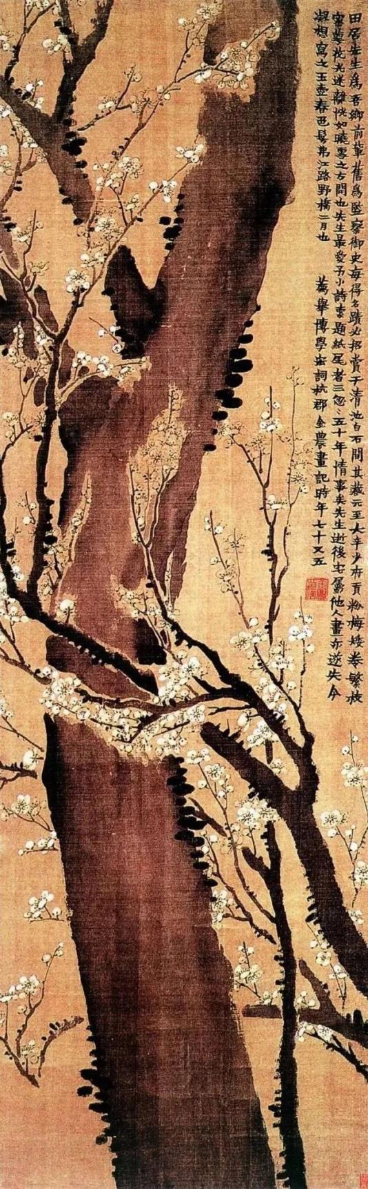 图中取梅树老干一截,通贯画幅正中,顶天立地,布局奇绝,又以大笔铺枝,小笔勾瓣,繁枝密萼,穿插左右,枝干以饱含水分的淡墨挥写,浓墨点苔,更显出老梅凌寒的性格。“花光迷离,恍如晓雪之方开”。右侧上端有作者自题,乃知为追思五十年前,观元至大辛少府贡粉矮梅卷情事,凝想而作,款署:“荐举博学宏词杭郡金农画记,时年七十又五。”此为金农老年精心之作。