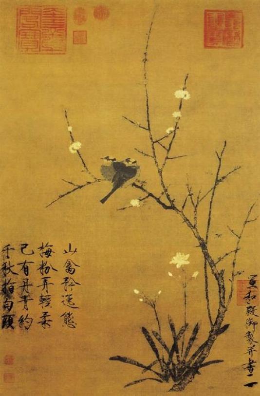 此图写寒梅怒放,一绶带鸟栖于枝上,另有一小雀在其下方啾啾呜叫。梅枝曲折,由墨笔勾出,淡墨皴染,梅花由铅白点染,晶莹剔透。绶带鸟及小雀刻画细致入微,一丝不苟,有北宋黄筌之意韵。
