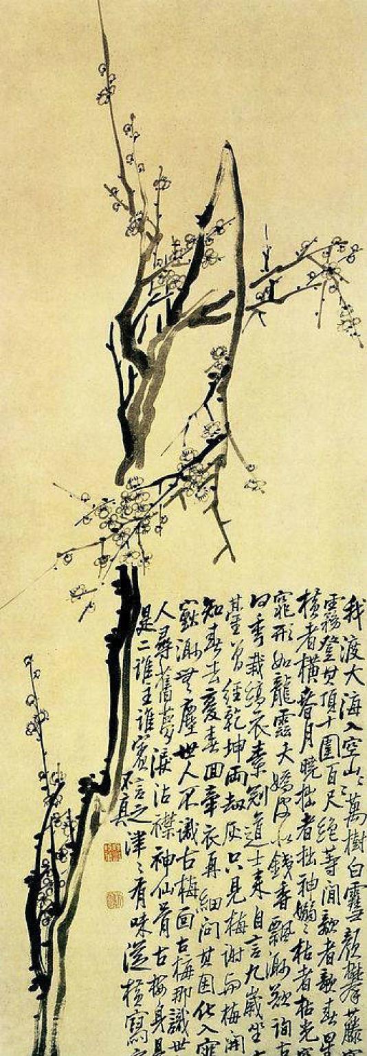 此幅构图别致,布局豪纵奇崛,气象峥嵘而清劲可爱。枝干纵横,以墨笔皴写,湿笔中又呈飞白,枯健如蟠龙虬曲,再横点重墨,更显苍老道劲。枝梢俏利,而嫩枝又笔直上伸,上下呼应。繁花散于嫩枝之间,只用简洁的双钩,千斛万蕊,冷艳寒香便扑面而来。妙在一缕烟雾横遮梅梢,更添隽拨清逸之致。