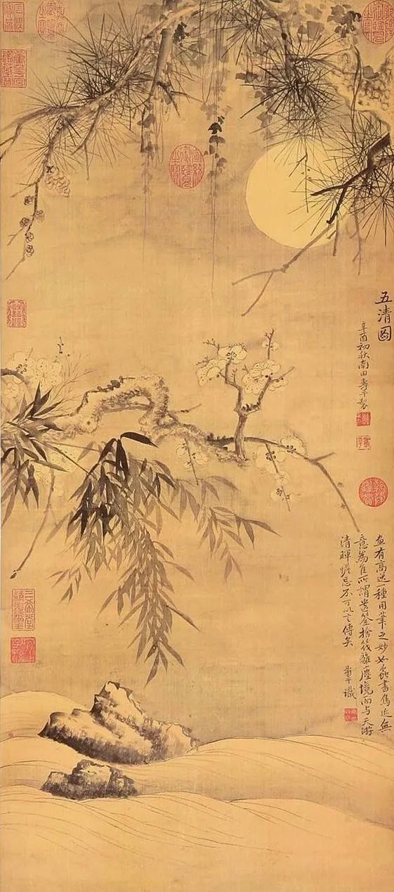 此图裁取梅树一角,老干苍劲,新枝挺发,繁花密萼,正反转侧,一片生机。枝干苍老古朴,花蕊挺劲清秀,运笔密而不乱,繁而不杂,墨气雄厚,一轮圆月,影照梅花,分外清逸。