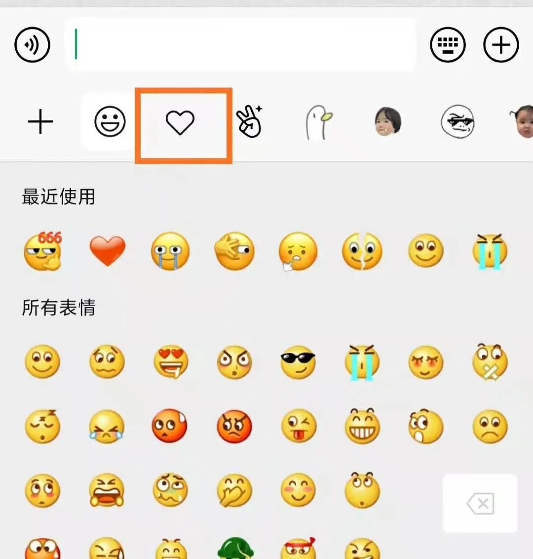 2.然后,点击微信表情,然后点击“心形”图标,出现“个人收藏”表情包页面;