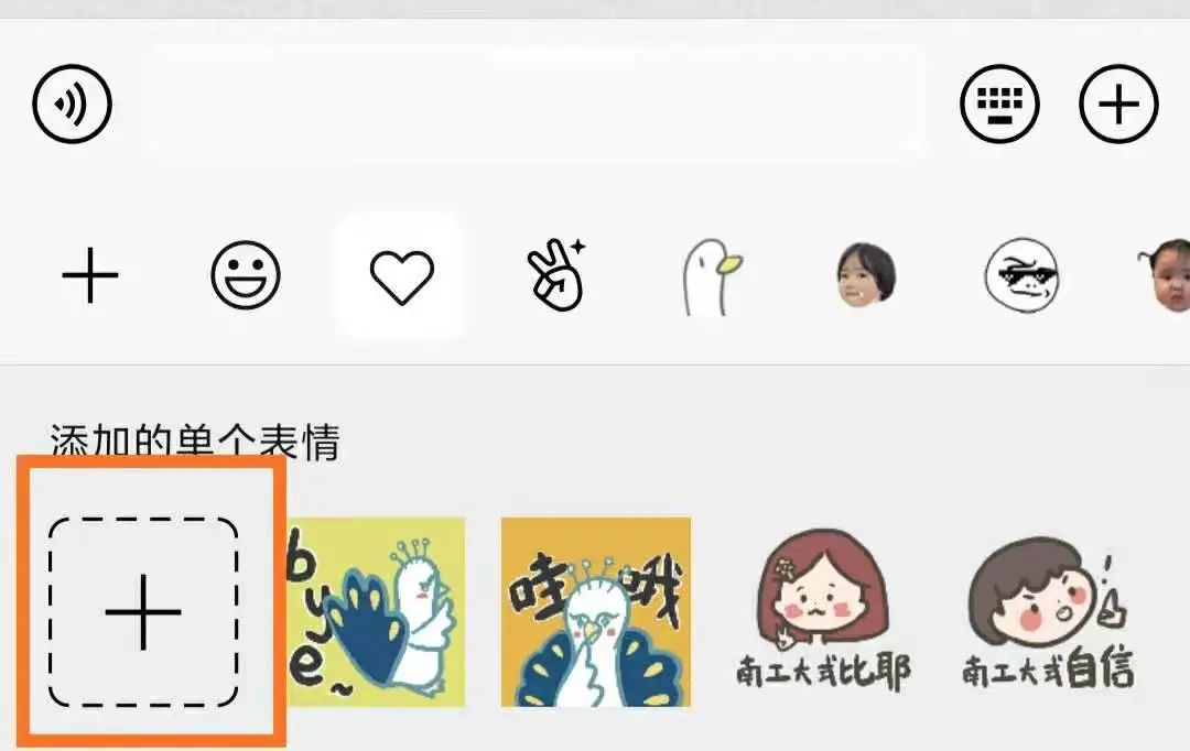 3.最后,点击下图圈出的“+”,选中存入相册的表情包,即可使用(注:透明系列的,按操作方可达到最好的使用效果)。