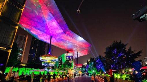 东郊记忆是在红光电子管厂旧址上,改建而成的现代文化产业园,目前也是成都一大文旅地标。晚上的东郊记忆,就像一个迷人眼的万花筒,更加摄人心魄。